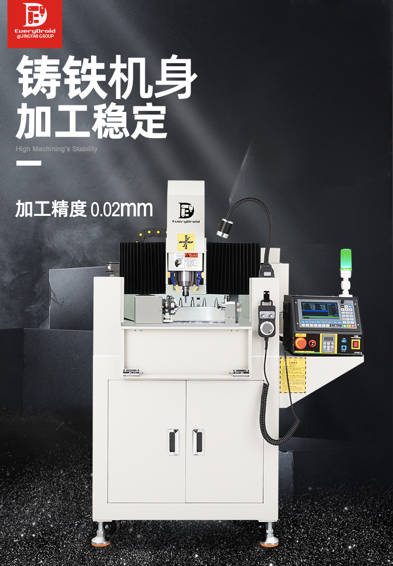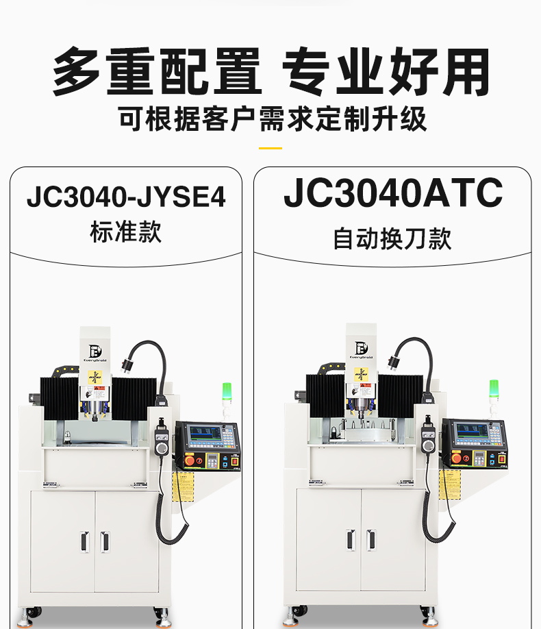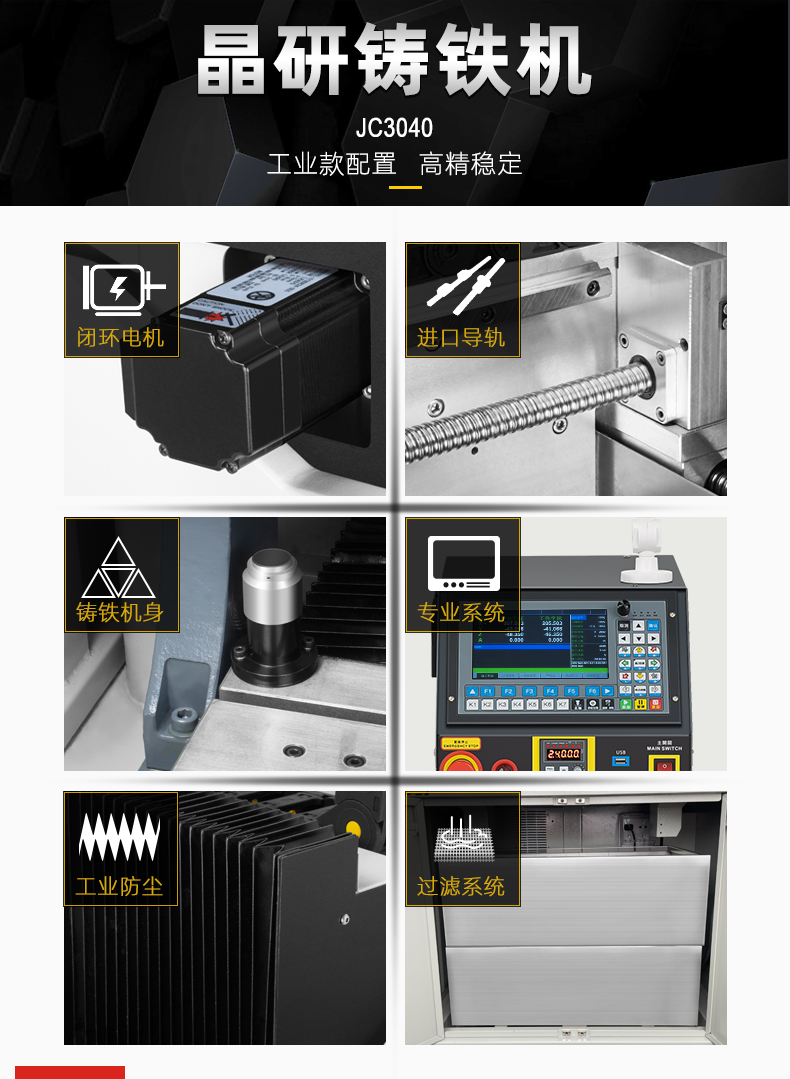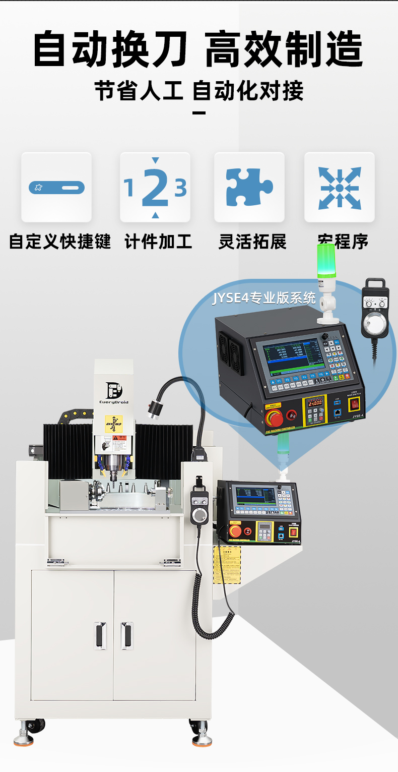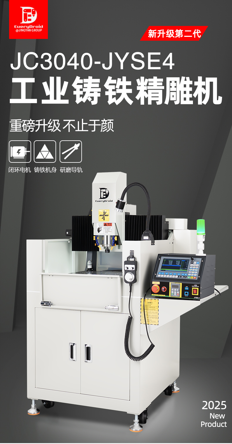 晶研V系列自動換刀鑄鐵精雕機是一款高效、穩(wěn)定、多功能的設(shè)備,具備專業(yè)過濾系統(tǒng)、自動換刀、4把刀庫和高轉(zhuǎn)速主軸等特點。它適用于多種材料加工,滿足不同行業(yè)需求,如45#鋼鞋模、模具制造、金屬和鋁合金零件加工、紫銅電極加工等精密任務(wù)。新升級的JC3040-JYSE4型號強調(diào)高精度和穩(wěn)定性,提供多重配置和立體加工的高效性能,設(shè)備配備閉環(huán)電機、風琴防塵處理和高防水性模具主軸,確保長時間穩(wěn)定運行。JYSE4控制系統(tǒng)支持斷電續(xù)雕和跳行加工,進一步提升加工效率。