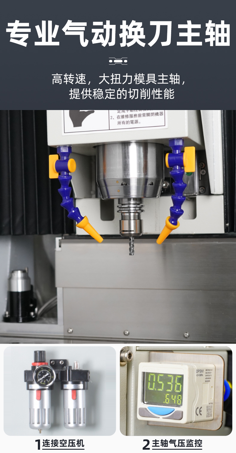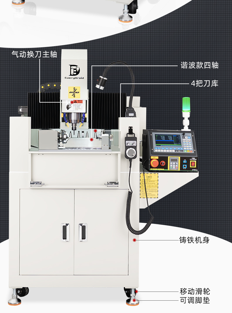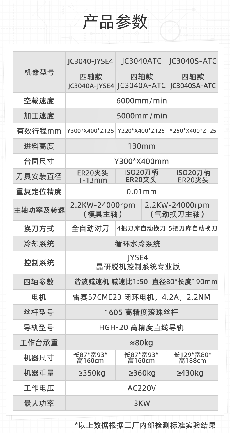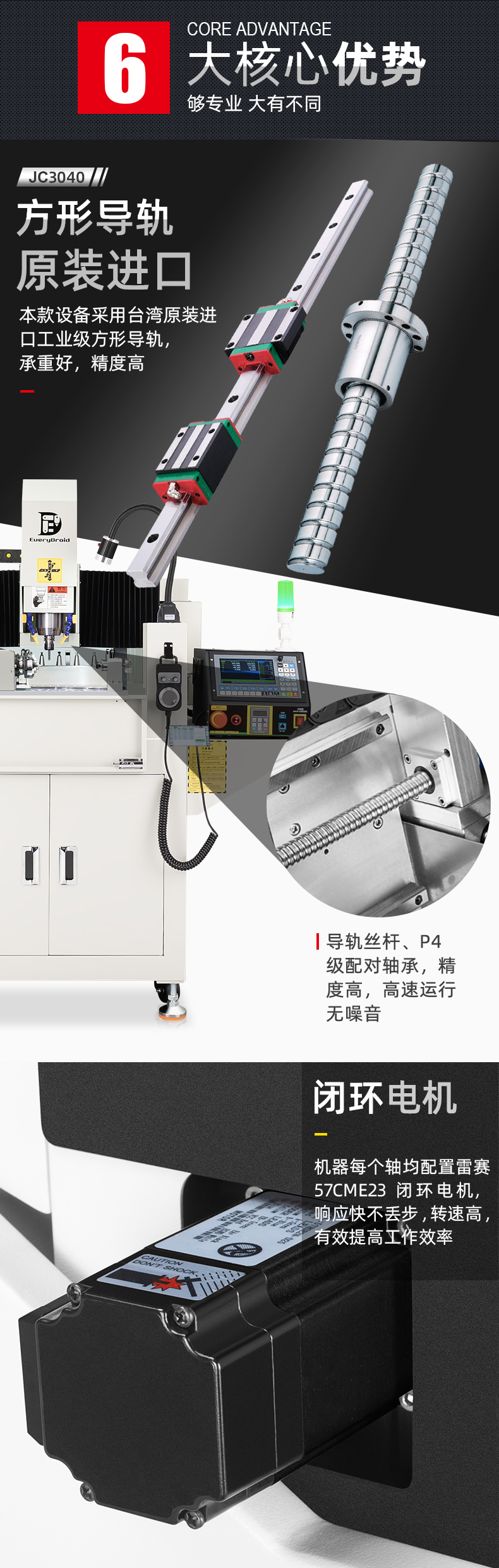 晶研V系列自動換刀鑄鐵精雕機是一款高效、穩(wěn)定、多功能的設(shè)備,具備專業(yè)過濾系統(tǒng)、自動換刀、4把刀庫和高轉(zhuǎn)速主軸等特點。它適用于多種材料加工,滿足不同行業(yè)需求,如45#鋼鞋模、模具制造、金屬和鋁合金零件加工、紫銅電極加工等精密任務(wù)。新升級的JC3040-JYSE4型號強調(diào)高精度和穩(wěn)定性,提供多重配置和立體加工的高效性能,設(shè)備配備閉環(huán)電機、風琴防塵處理和高防水性模具主軸,確保長時間穩(wěn)定運行。JYSE4控制系統(tǒng)支持斷電續(xù)雕和跳行加工,進一步提升加工效率。