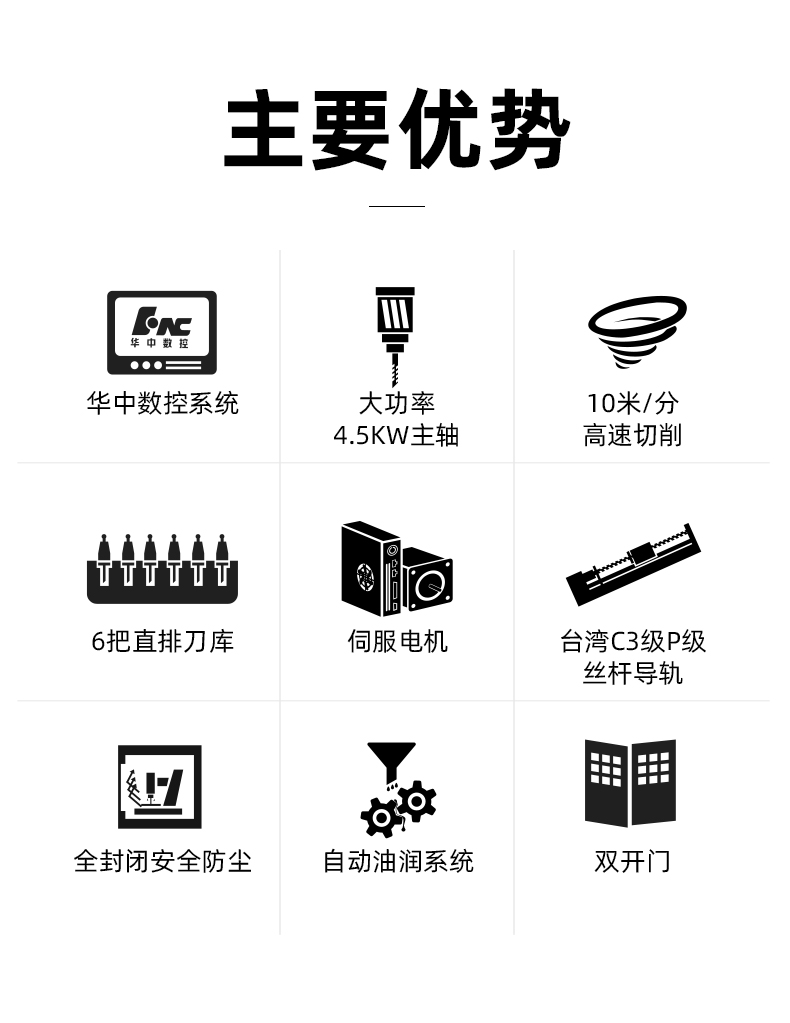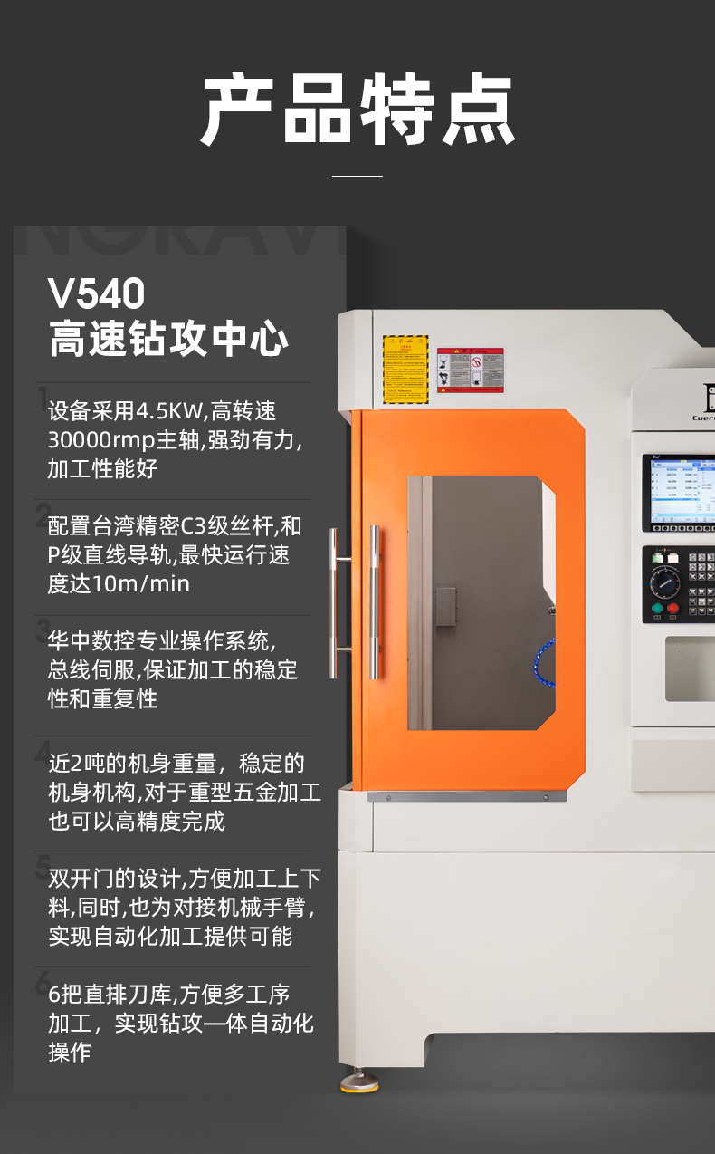 晶研V540高速鉆攻中心,采用4.5KW、30000rmp高轉(zhuǎn)速主軸,強勁有力,加工性能佳。配置臺灣C3級絲桿和P級直線導軌,最快運行速度達10m/min。搭載華中數(shù)控專業(yè)操作系統(tǒng),總線伺服,確保加工穩(wěn)定性和重復性。機身重近2噸,結(jié)構(gòu)穩(wěn)定,適配重型五金高精度加工。雙開門設(shè)計,便于上下料及對接機械手臂實現(xiàn)自動化。6把直排刀庫,支持鉆攻一體自動化操作。