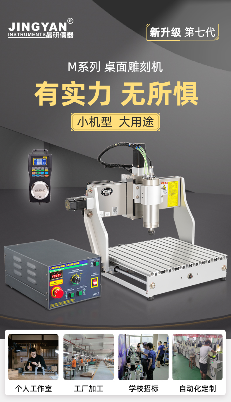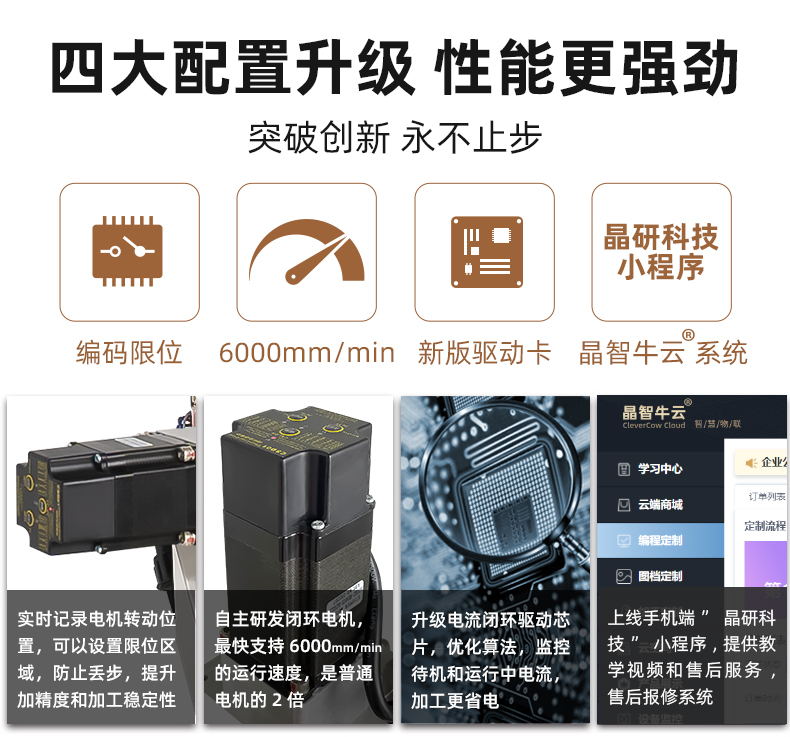 晶研M系列桌面雕刻機(jī)提供多種功率選擇,適應(yīng)不同硬度材料加工需求。其高精度編碼限位系統(tǒng)、高速閉環(huán)電機(jī)和智能驅(qū)動(dòng)卡,確保了加工的精度、速度和節(jié)能效果。此外,晶智牛云系統(tǒng)和手機(jī)小程序?yàn)橛脩籼峁┝吮憬莸慕虒W(xué)和售后服務(wù),使其成為工業(yè)應(yīng)用的理想選擇。
