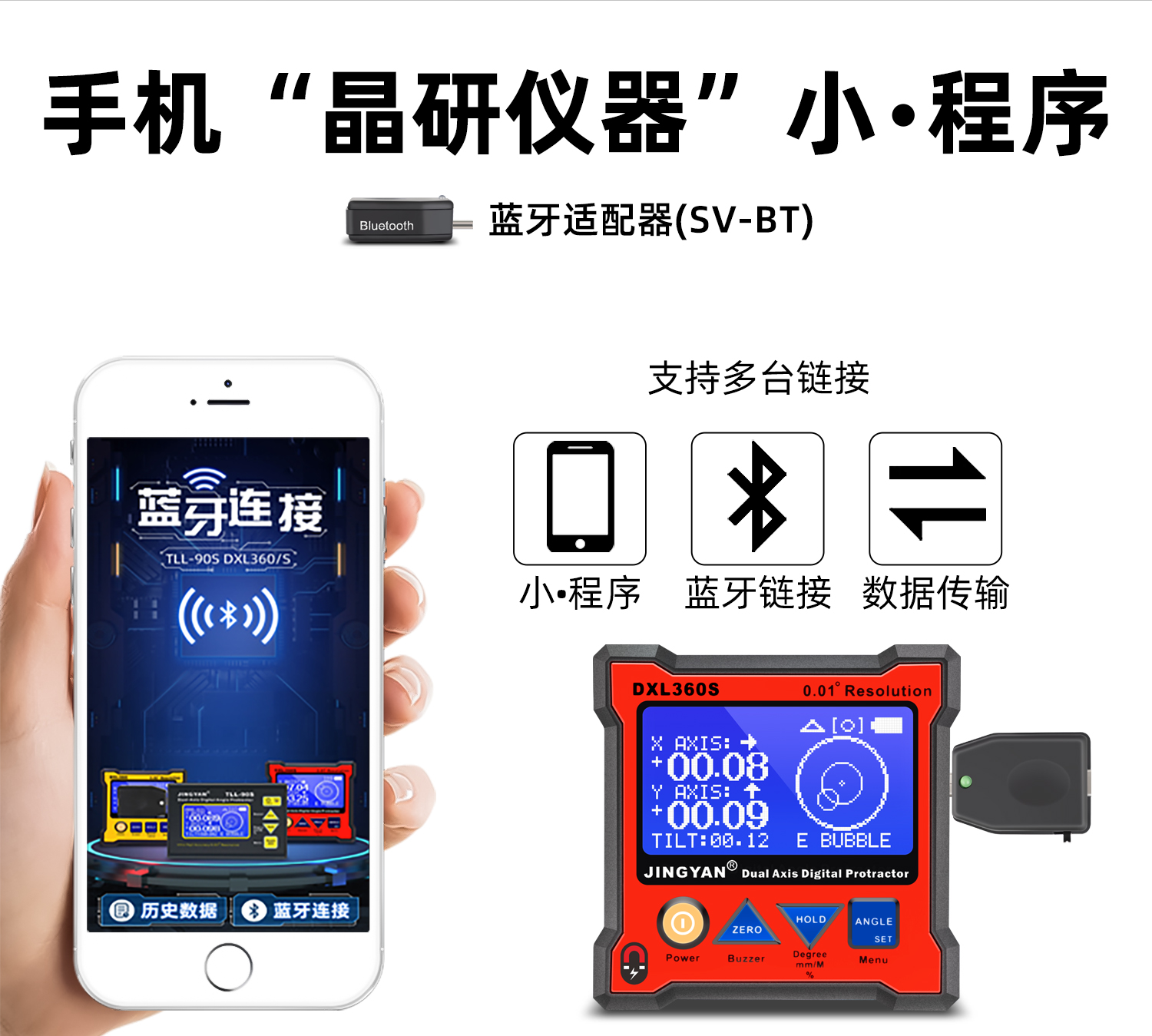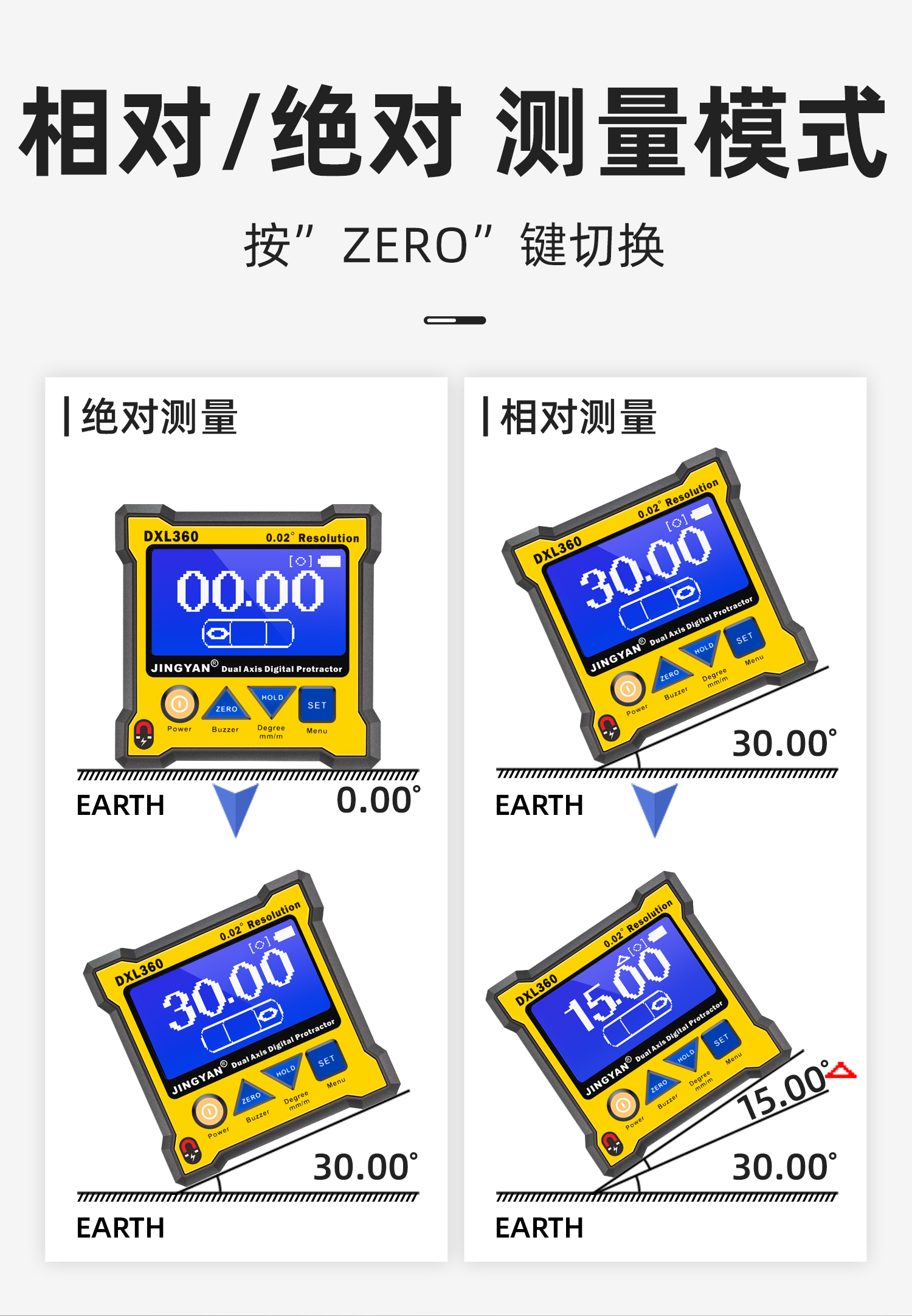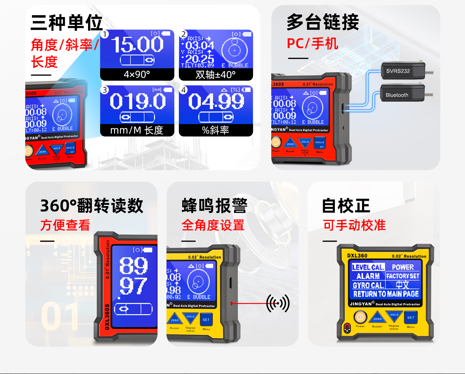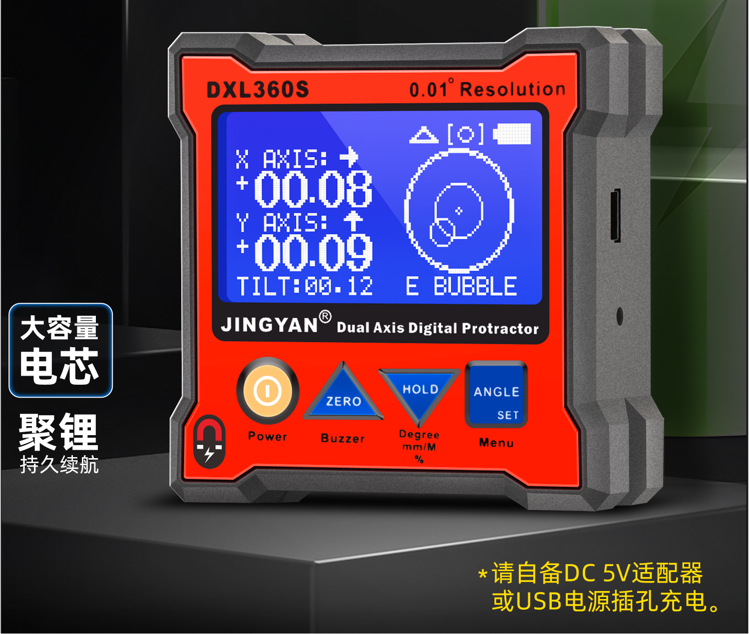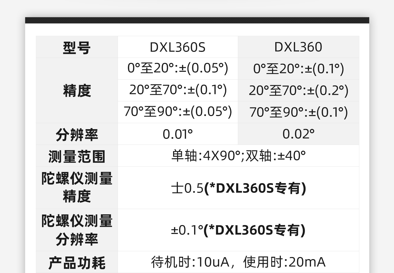 DXL360/S是一款專業(yè)測量水平和空間相對夾角(*DXL360S專有)的高精度數(shù)顯傾角儀/水平儀,它基于微機(jī)電系統(tǒng)(MEMS)的先進(jìn)技術(shù),結(jié)合優(yōu)化的補償模型算法,保證傾角儀測量的穩(wěn)定性和重復(fù)性。DXL360S精度高達(dá)0.05°,分辨率0.01°,可以采用3種測量單位顯示(角度、毫米/米、斜率),特有的空間相對夾角功能(GYRO),可不受環(huán)境限制,測量任意平面之間相對夾角,陀螺儀測量精度±0.5°。DXL360實現(xiàn)最好精度0.1°,分辨率0.02°,可以采用2種測量單位顯示(角度、毫米/米)。DXL360/S支持單軸4×90°,雙軸±40°測量,底部和背部測量基準(zhǔn)面有強磁性,V型凹槽設(shè)計便于放置在圓管上進(jìn)行測量。雙重數(shù)據(jù)存儲功能,連接電腦或手機(jī)進(jìn)行數(shù)據(jù)傳輸。DXL360/S廣泛應(yīng)用于機(jī)械制造、汽車維修、醫(yī)療行業(yè)、木材加工、通訊檢測、家居裝潢等用途。DXL360/S以其豐富的功能和實用性,廣受全球客戶青睞。