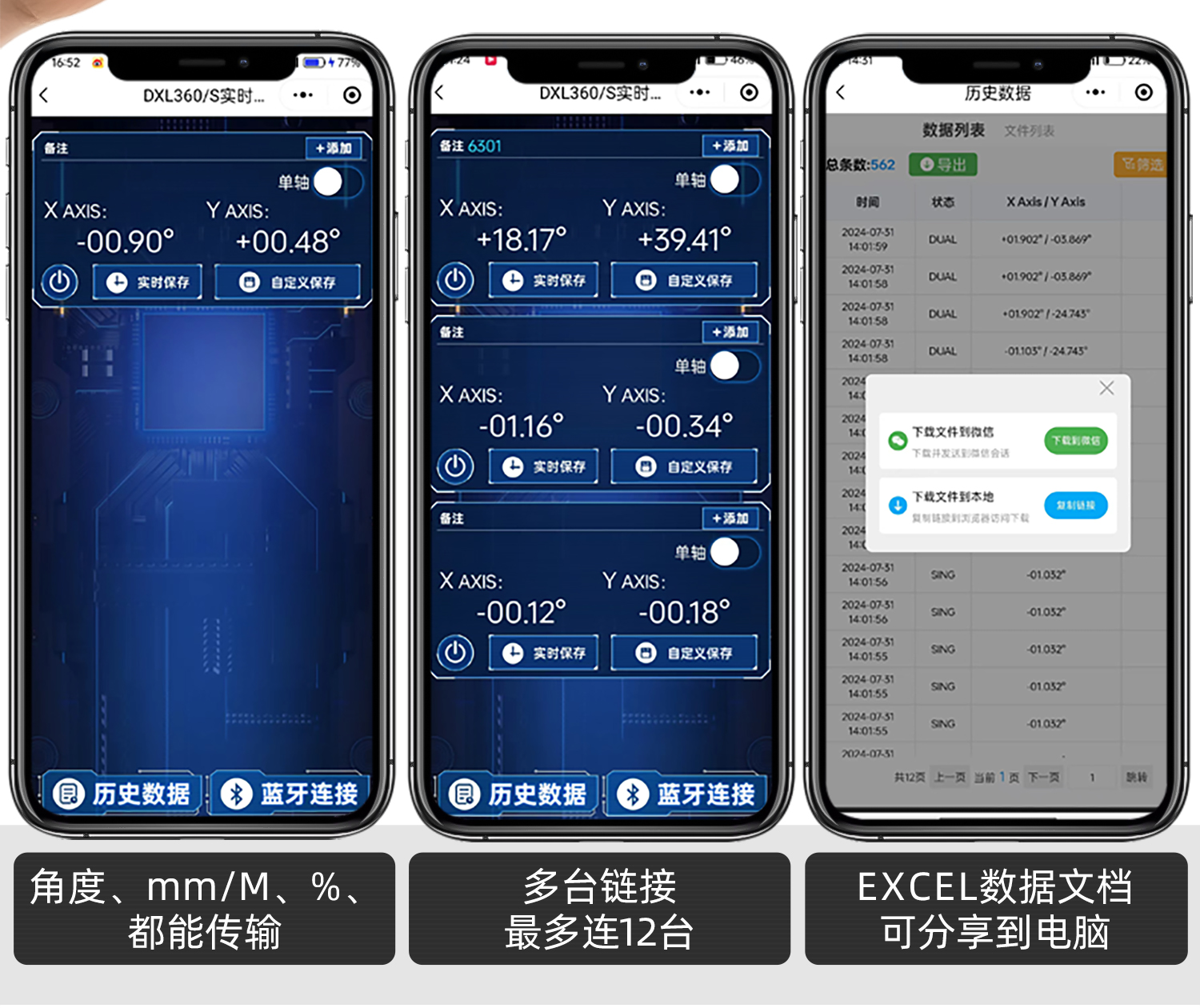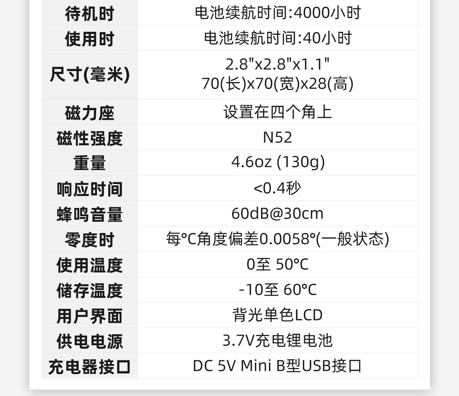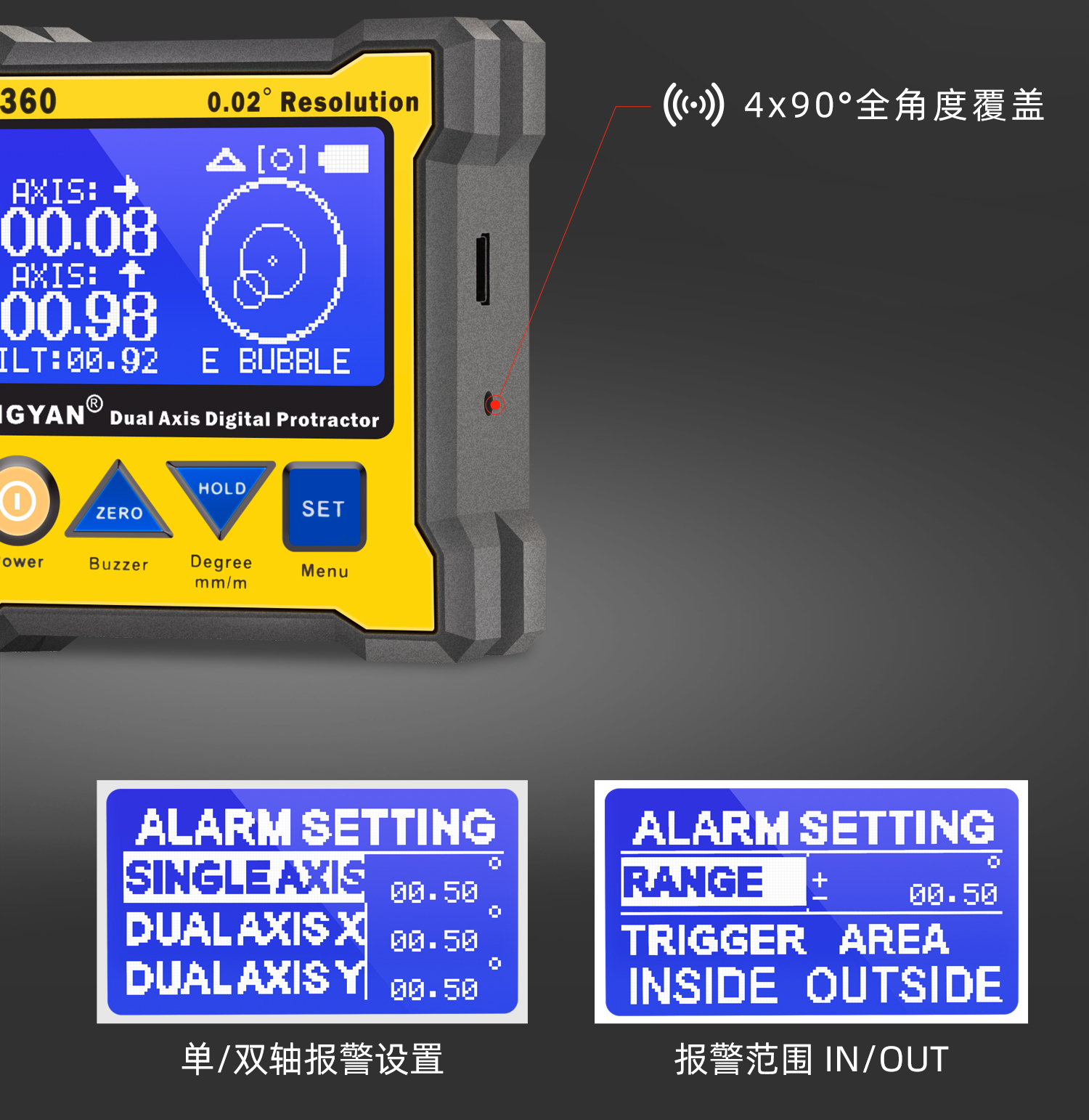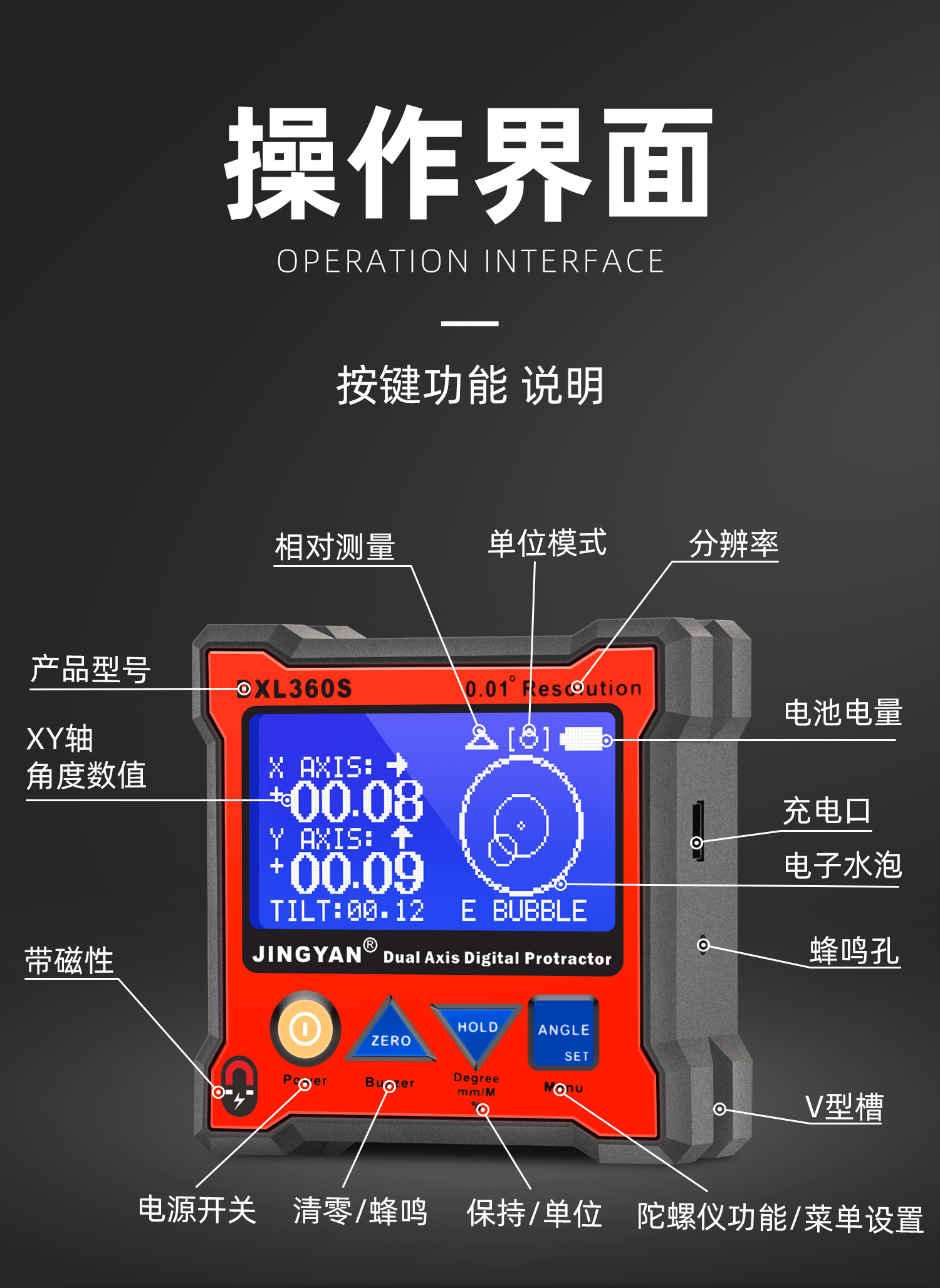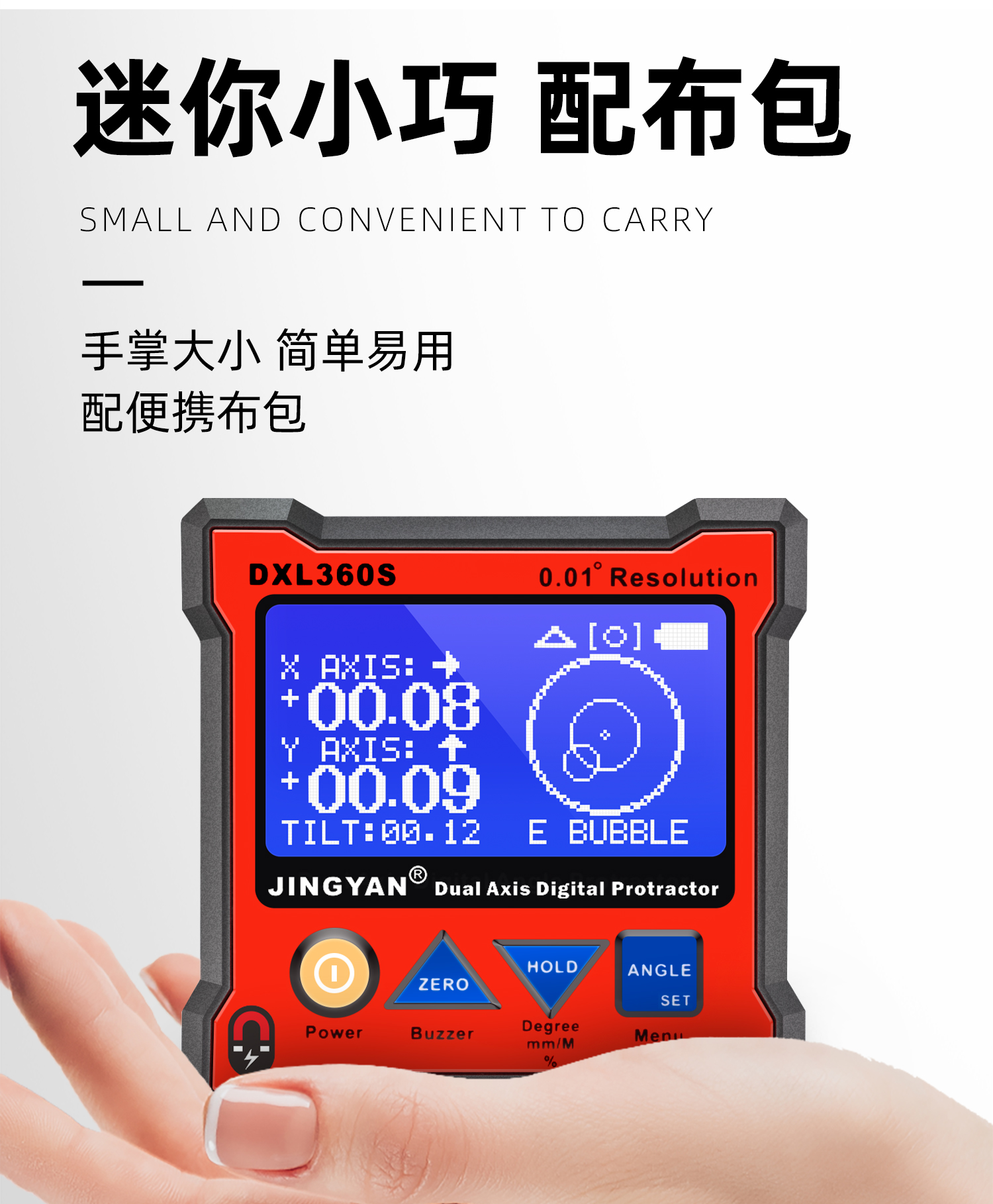 DXL360/S是一款專業(yè)測量水平和空間相對夾角(*DXL360S專有)的高精度數(shù)顯傾角儀/水平儀,它基于微機(jī)電系統(tǒng)(MEMS)的先進(jìn)技術(shù),結(jié)合優(yōu)化的補償模型算法,保證傾角儀測量的穩(wěn)定性和重復(fù)性。DXL360S精度高達(dá)0.05°,分辨率0.01°,可以采用3種測量單位顯示(角度、毫米/米、斜率),特有的空間相對夾角功能(GYRO),可不受環(huán)境限制,測量任意平面之間相對夾角,陀螺儀測量精度±0.5°。DXL360實現(xiàn)最好精度0.1°,分辨率0.02°,可以采用2種測量單位顯示(角度、毫米/米)。DXL360/S支持單軸4×90°,雙軸±40°測量,底部和背部測量基準(zhǔn)面有強磁性,V型凹槽設(shè)計便于放置在圓管上進(jìn)行測量。雙重數(shù)據(jù)存儲功能,連接電腦或手機(jī)進(jìn)行數(shù)據(jù)傳輸。DXL360/S廣泛應(yīng)用于機(jī)械制造、汽車維修、醫(yī)療行業(yè)、木材加工、通訊檢測、家居裝潢等用途。DXL360/S以其豐富的功能和實用性,廣受全球客戶青睞。