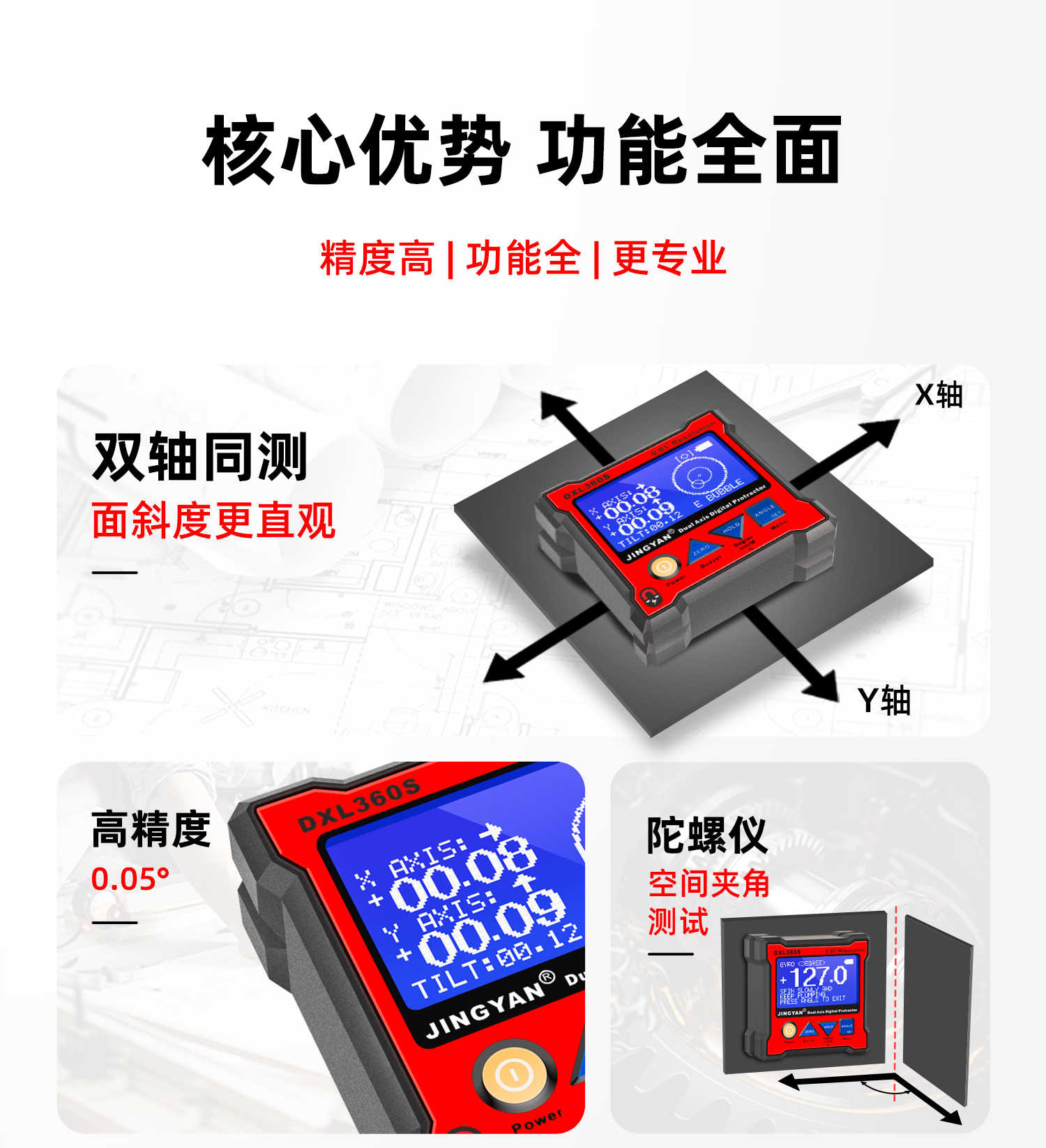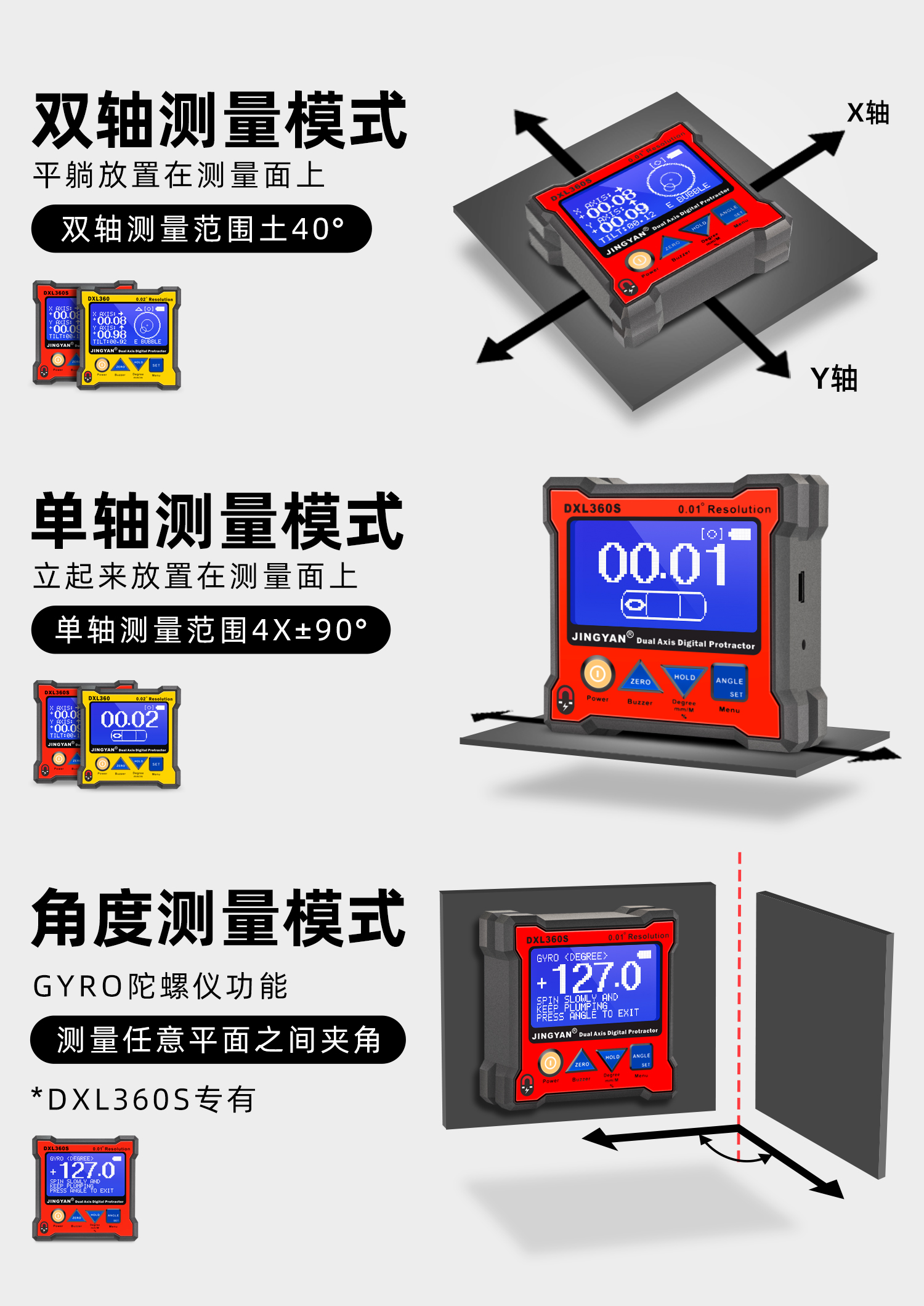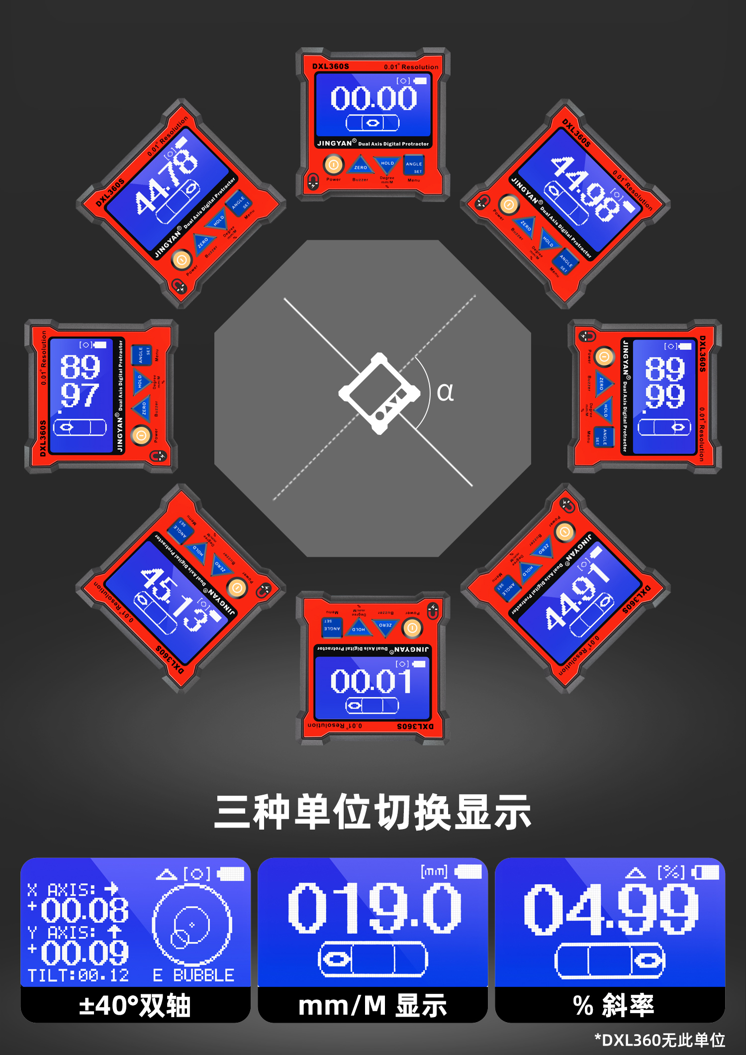 DXL360/S是一款專業(yè)測量水平和空間相對夾角(*DXL360S專有)的高精度數(shù)顯傾角儀/水平儀,它基于微機(jī)電系統(tǒng)(MEMS)的先進(jìn)技術(shù),結(jié)合優(yōu)化的補(bǔ)償模型算法,保證傾角儀測量的穩(wěn)定性和重復(fù)性。DXL360S精度高達(dá)0.05°,分辨率0.01°,可以采用3種測量單位顯示(角度、毫米/米、斜率),特有的空間相對夾角功能(GYRO),可不受環(huán)境限制,測量任意平面之間相對夾角,陀螺儀測量精度±0.5°。DXL360實(shí)現(xiàn)最好精度0.1°,分辨率0.02°,可以采用2種測量單位顯示(角度、毫米/米)。DXL360/S支持單軸4×90°,雙軸±40°測量,底部和背部測量基準(zhǔn)面有強(qiáng)磁性,V型凹槽設(shè)計(jì)便于放置在圓管上進(jìn)行測量。雙重?cái)?shù)據(jù)存儲功能,連接電腦或手機(jī)進(jìn)行數(shù)據(jù)傳輸。DXL360/S廣泛應(yīng)用于機(jī)械制造、汽車維修、醫(yī)療行業(yè)、木材加工、通訊檢測、家居裝潢等用途。DXL360/S以其豐富的功能和實(shí)用性,廣受全球客戶青睞。