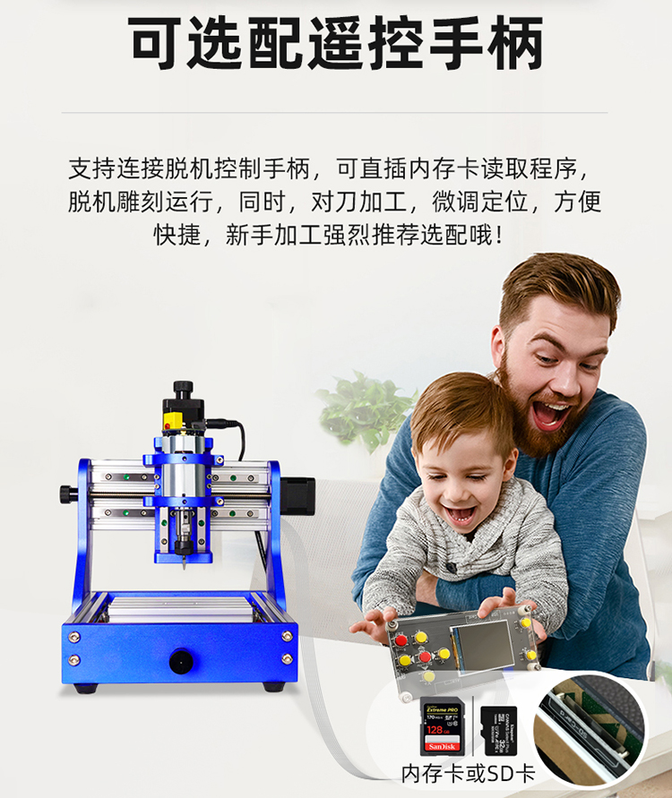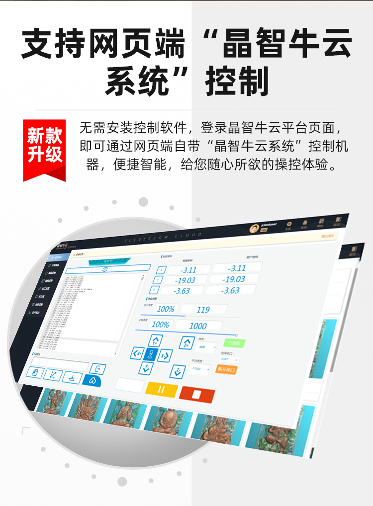 迷你雕刻機支持一機多用,多功能數(shù)控雕刻和激光雕刻切換使用,個性化加工、操作簡單。無需安裝控制軟件,登錄晶智牛云平臺頁面,即可通過網(wǎng)頁端自帶“晶智牛云系統(tǒng)”控制機器,便捷智能,給您隨心所欲的操控體驗。晶智牛云平臺提供可以直接加工使用的代碼程序,方便新手客戶快速上手,圖庫和代碼程序會不定時更新,為大家提供更優(yōu)質(zhì)便捷的服務(wù)體驗。支持連接脫機控制手柄,可直插內(nèi)存卡讀取程序,脫機雕刻運行,同時,對刀加工,微調(diào)定位,方便快捷,新手加工強烈推薦選配哦!