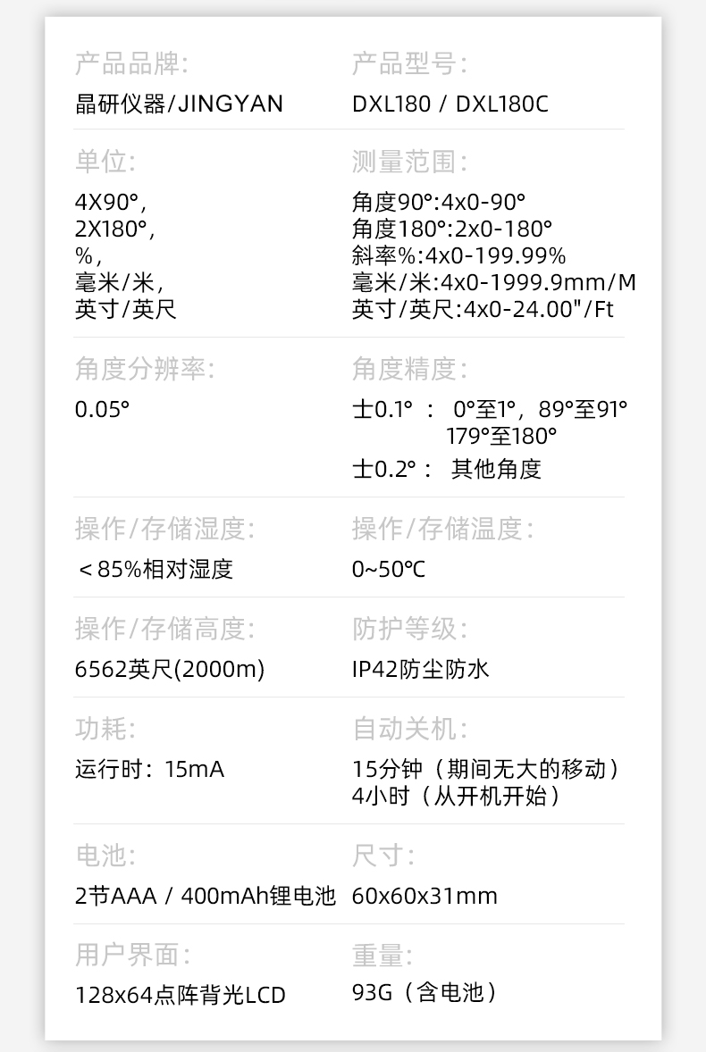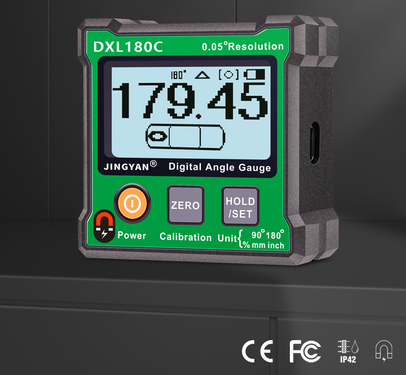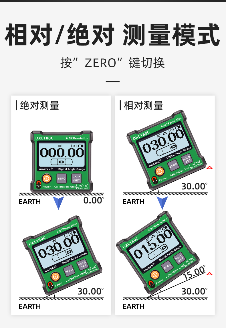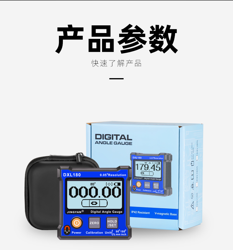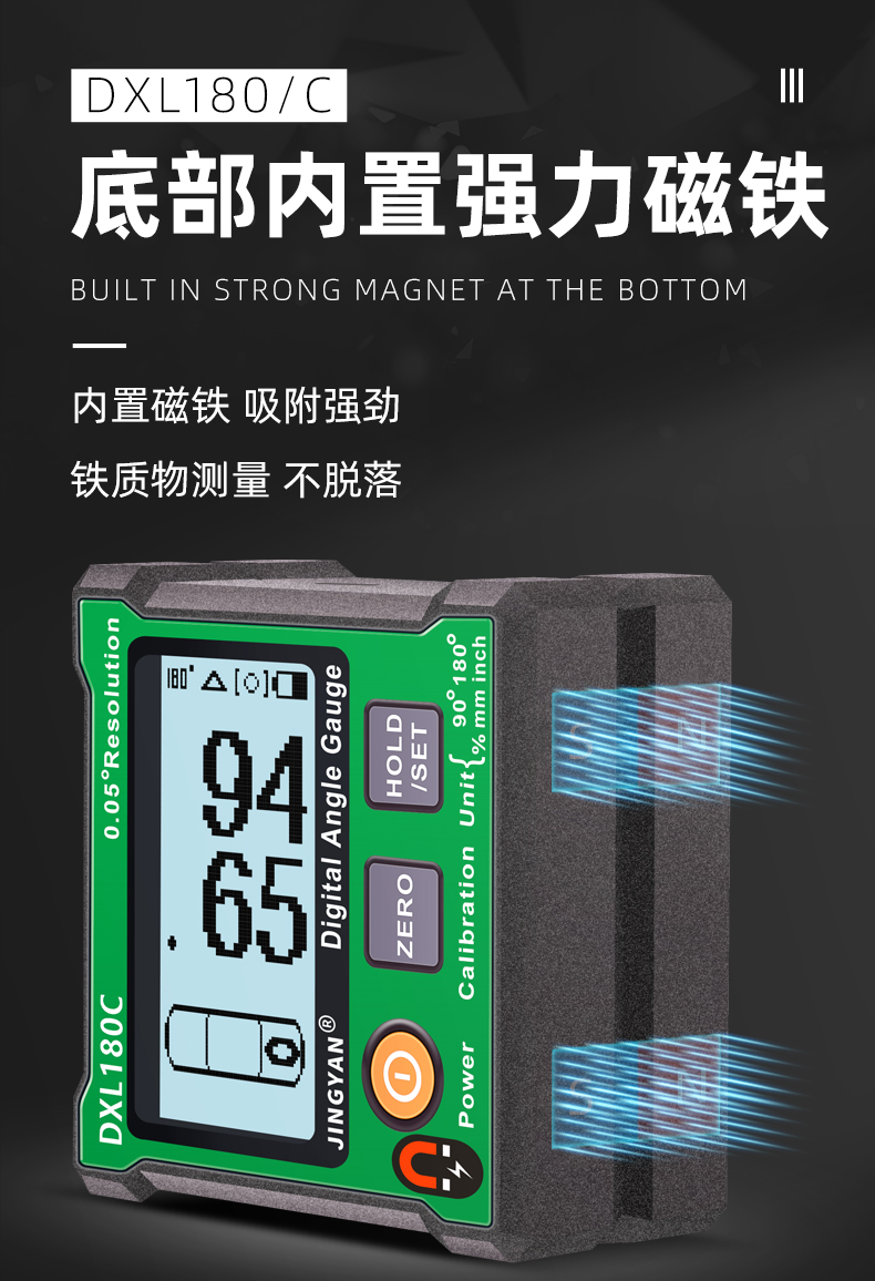 DXL180/C是一款可以使用多種單位顯示的數(shù)字角度儀,支持單位為角度、斜率、英寸和毫米/米的讀數(shù)。測(cè)量范圍為2*0-180°和4*0-90°,儀器底部測(cè)量面具有強(qiáng)力磁性。V形凹槽設(shè)計(jì)便于放置在圓形管上進(jìn)行測(cè)量。支持IP42等級(jí)防塵防水,背面預(yù)留M4螺絲孔,方便安裝固定。DXL180/C廣泛應(yīng)用于木工切割、機(jī)械制造、裝修設(shè)計(jì)、攝影愛(ài)好、產(chǎn)品檢測(cè)等領(lǐng)域。