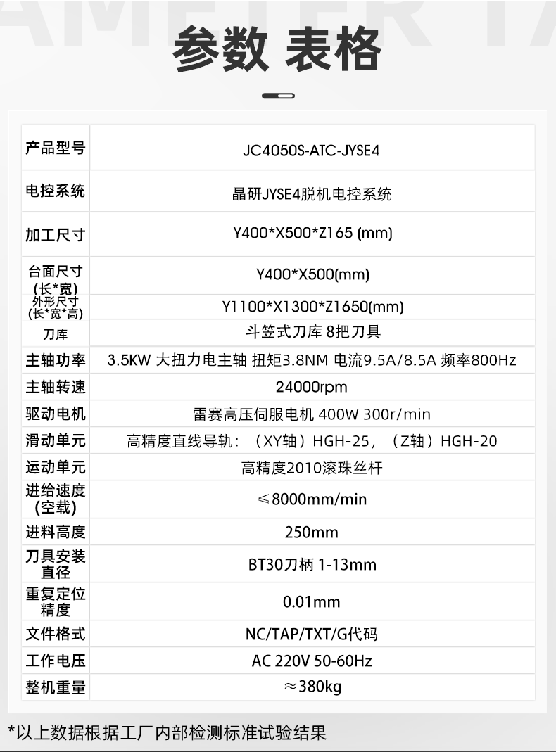 該設(shè)備采用3.5KW大扭力電主軸BT30刀柄,刀具最大裝夾直徑13mm,斗簽式自動換刀刀庫可配置8把刀具,滿足多工序換刀加工,適用更多應(yīng)用場景;升級高精高速2010滾珠絲桿和HGH25直線導(dǎo)軌,精度高,支持批量加工生產(chǎn),性能穩(wěn)定;配套雷賽高壓伺服電機(jī),400W,300r/min,可實現(xiàn)8000mm/min的加工速度,滿足高效加工生產(chǎn)需求;晶研JYSE4專業(yè)版脫機(jī)系統(tǒng)無需鏈接電腦,U盤讀取程序。支持?jǐn)嚯娎m(xù)雕,跳行加工,手輪引導(dǎo),一鍵啟停等功能,批量加工,簡單實用;主軸循環(huán)水冷系統(tǒng),自主設(shè)計干凈環(huán)保。主軸高速運行,循環(huán)冷卻液可以快速帶走主軸熱量,支持長時間運行,主軸冷卻效果非常好。
