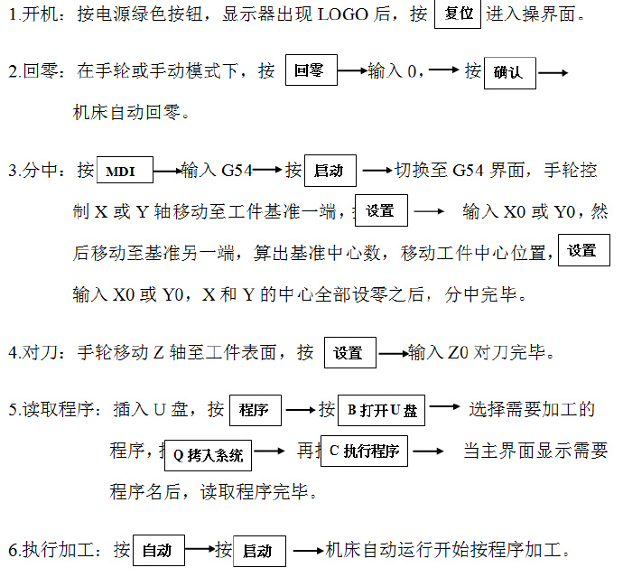 對刀操作是由Z軸至加工件表面,進行設(shè)置輸入Z0進行對刀完畢。數(shù)控系統(tǒng)的編程與程序設(shè)置需先插入U盤,按‘程序’按鈕,進出界面選擇‘B打開U盤’的時候,選擇需要加工的程序,按‘Q拷入系統(tǒng)’在界面上按‘C執(zhí)行程序’,當(dāng)主界面先死需要的程序名后,讀取程序完畢。