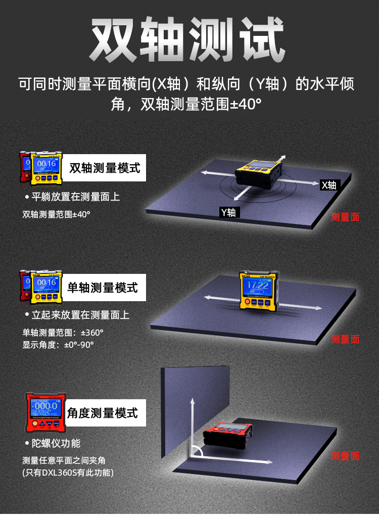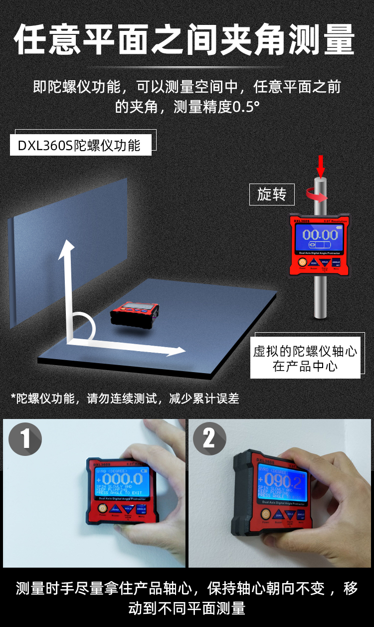 DXL360S傾角儀支持空間任意平面之間夾角測試(即陀螺儀功能),可以測試空間平面中,任意兩個(gè)平面之間相對角度,測量精度0.5°。對于復(fù)雜的測試環(huán)境或者不相鄰的兩個(gè)測試面,有了陀螺儀功能,讓測試他們之間的夾角變成了可能。