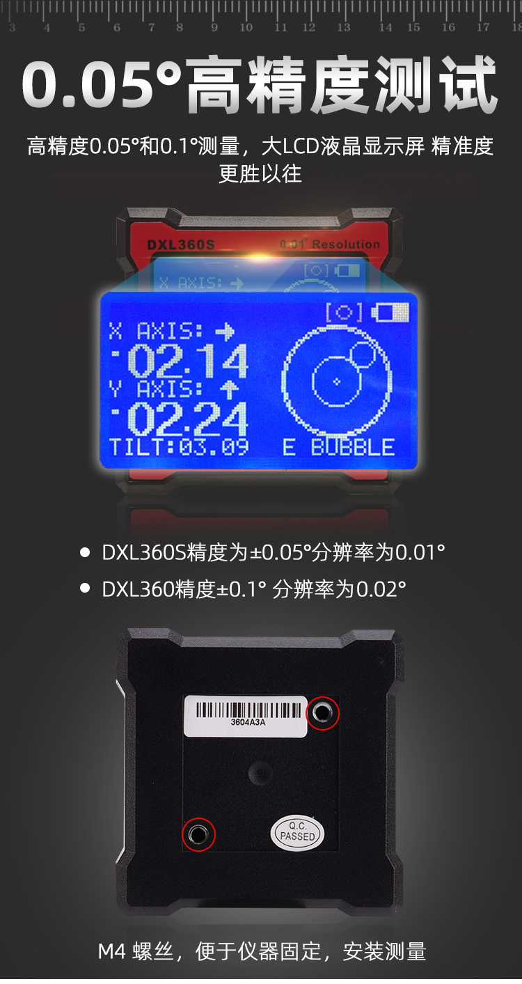 對于測試要求比較高的場景,精準(zhǔn)度是非常重要的一個(gè)衡量標(biāo)準(zhǔn),細(xì)微的偏差都可能產(chǎn)生不良的后果。晶研的這款DXL360S雙軸水平儀,高精度±0.05°,分辨率可達(dá)0.01°支持雙軸測試±40°的測量范圍,可以勝任大部分高精度測試場景。清晰的LCD顯示屏,能夠方面我們更加輕松直觀的讀數(shù),精準(zhǔn)度更勝以往!