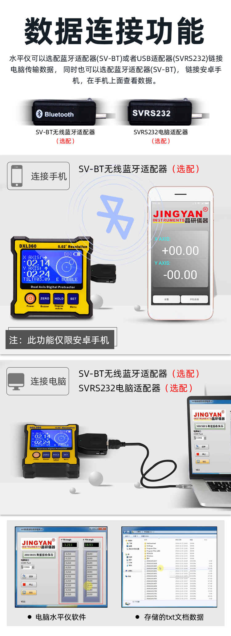 晶研全系列雙軸水平儀,均支持聯(lián)接手機(jī)APP/電腦軟件進(jìn)行數(shù)據(jù)傳輸功能,便于數(shù)據(jù)分析,繪制表格,數(shù)據(jù)累計(jì)等使用。還可以支持一機(jī)聯(lián)接多臺(tái)水平儀,同時(shí)數(shù)據(jù)傳輸。有線傳輸/藍(lán)牙傳輸都能夠支持!靈活的拓展功能,專為技術(shù)人員測試使用。專業(yè)貼心,只為您用的更好!
