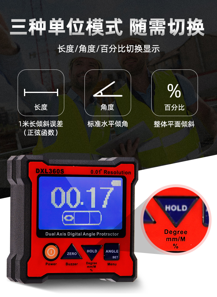 很多情況下,我們會(huì)發(fā)現(xiàn),僅僅只能夠顯示角度單位已經(jīng)無法滿足我們的要求,把角度單位換算成長度單位mm(正弦函數(shù)),或者把角度單位直觀的告訴我傾斜率到底是多少?這些功能全部都已經(jīng)為您想好了。晶研DXL360S傾角儀支持這三種單位檢測模式,隨心切換使用,專業(yè)智能!